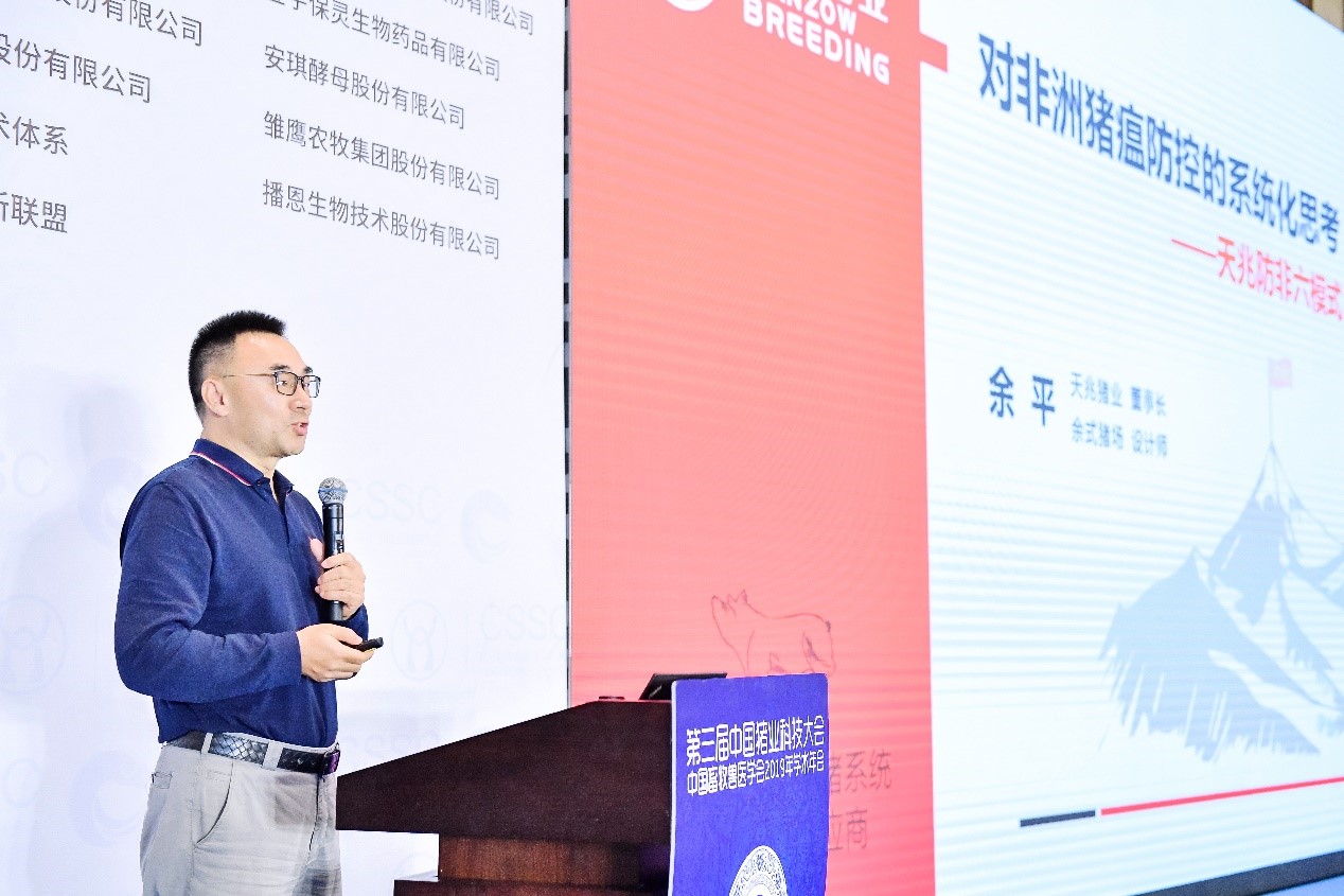 天兆豬業(yè)作為此次大會(huì)的發(fā)起人單位,對(duì)大會(huì)予以了全力支持。天兆豬業(yè)董事長(zhǎng)余平在會(huì)上作了《對(duì)非洲豬瘟防控的系統(tǒng)化思考——天兆防非六模式》的主題報(bào)告,分享了在這場(chǎng)令養(yǎng)豬人談“非”色變的重大疫情中,作為養(yǎng)豬業(yè)的上游,種豬企業(yè)如何做好生物安全防控。